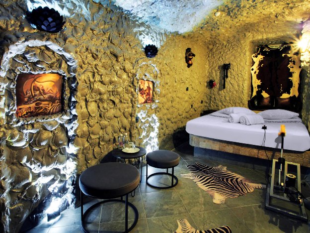 Вот, например, номер в стиле пещеры на Панфиловском переулке в Москве: